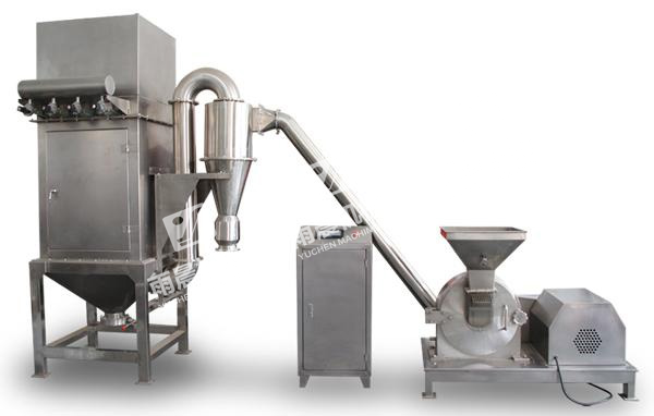 The machine is composed of a feeding hopper, a grading wheel, a crushing blade, a gear ring, a crushing motor, a discharge port, a fan blade, an aggregate box, a vacuum box, and other parts. The materials enter the crushing chamber from the feeding hopper and are crushed through high-speed rotating blades. The distance between the grading wheel and the grading disc is adjusted to achieve the required material fineness. The high-speed rotating blades guide the materials that meet the requirements from the crushing chamber to the cloth bags in the aggregate box. Materials that do not meet the requirements continue to be crushed in the crushing chamber. The dust generated by the cloth bags in the aggregate box is collected by the vacuum box. The unit is designed according to GMP standards, with a simple structure, convenient operation and cleaning, low noise, high output, and all machines are made of high-quality stainless steel. There is no dust flying during the crushing process.