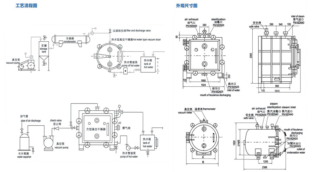 1.干燥器身:根據(jù)不同的生產(chǎn)要求,干燥器身可由A3鋼板或A3鋼板內(nèi)貼1Cr18Ni9Ti不銹鋼板或1Cr18Ni9Ti不銹鋼板制作。1Cr18Ni9Ti不銹鋼板器壁便于清洗,有利于達到藥物的無菌要求,對酸堿具有良好的防腐蝕作用。器身前后設(shè)有三個視鏡,便于觀察物料干燥情況,視鏡襯墊系由硅橡膠制作,既密封又適用藥物無毒干燥要求。器身上設(shè)有真空表和溫度計,還設(shè)有消毒口,用于對物料干燥前或干燥中后期的消毒和保護。消毒氣體和保護氣體由用戶自擇,消毒過程中必須關(guān)閉真空泵與真空閥門,消毒結(jié)束關(guān)閉消毒口后,才能開啟真空泵打開真空閥門抽真空。如需無菌操作,應(yīng)配備蒸汽過濾器(用于消毒口)及空氣過濾器(用于放空閥口)。考慮到消毒口輸入蒸汽壓過高,器身上還裝有安全閥用于保護。器身上設(shè)有一個蒸汽進口(或熱水出口),器身底下設(shè)有疏水器接口(或熱水進口)排污口。